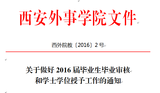 根据《西安外事学院教学实施与学籍管理规定》、《西安外事学院普通本科生学士学位授予工作实施细则》(西外院教{2012}27号)(以下简称《学位授予细则》)等文件要求,为做好2016届毕业生的毕业资格审核和本科毕业生的学士学位授予资格审核工作,经学校研究决定,即日起启动毕业生资格审核工作,请各相关单位按通知要求,认真做好此项工作。现将有关事项通知如下: