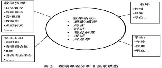 美国在线课程的首要构成要素就是教学活动。1981年第一门在线课程就是关于计算机会议系统(Computer Conference)支持的讨论交流活动。笔者对中外网络课程类别进行了分析,提出了图2所示的在线课程分析5要素模型: