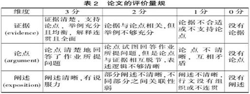 在Coursera平台上,有一门普林斯顿大学开设的《A History of the World since 1300》。该课程有一项作业,要求学生在听视频讲座、读书、浏览同伴讨论帖的基础上,收集论据,回答老师在视频提出的问题。这是一个开放性的作业,学生可选择任何话题,相互之间似乎没有可比性。教师设计了一个有证据、论点、阐述三个维度,4个等级的评价量规(见表2)。