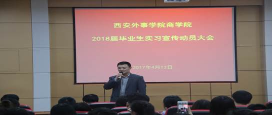 为了扎实做好实习工作,根据《陕西省教育厅关于进一步加强高校学生实习工作的意见》)和《关陕西省教育厅于报送加强学生实习工作实施方案的通知》以及我校关于实习工作的文件要求,为强化实践教学环节,提高人才培养质量,4月12日下午2点,商学院在六号教学楼四楼多功能报告厅举办了2018届毕业生实习动员大会,会议由商学院舒忠副院长主持,参会的有学院领导,14级本科、15级高职学生代表,各系主任、副主任,系秘书,全体辅导员。